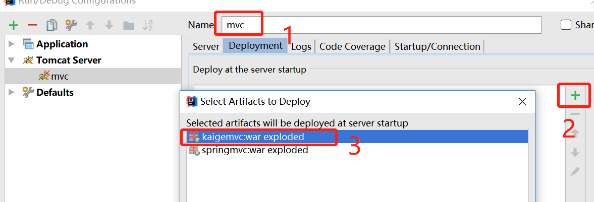 在弹出层,选择Deployment,添加项目名称,然后点击右边加号,选在刚才创建的项目。kaigemvc。如下图: