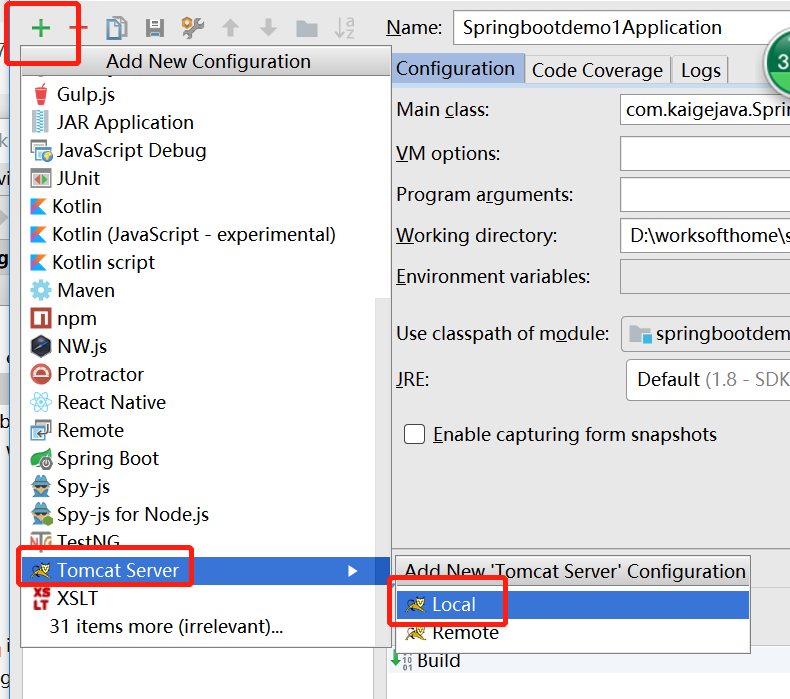 在弹出层。点击加号。然后下拉到Tomcat Server,然后选择Local.如下图: