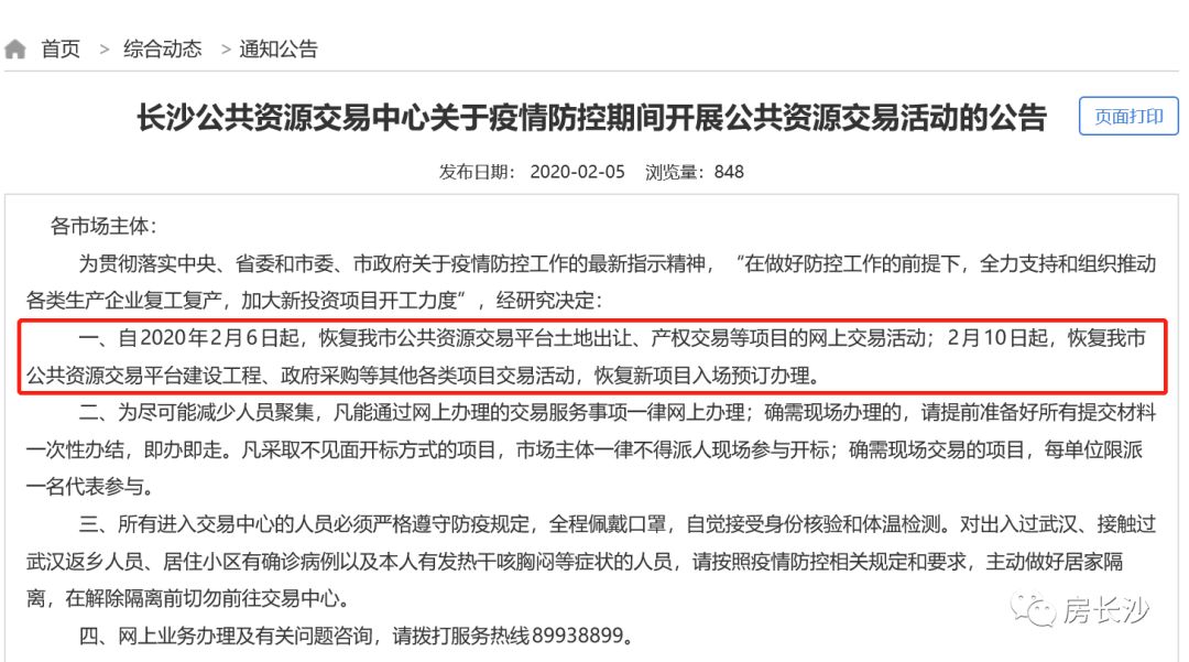 据长沙公共资源网此前消息显示,自2020年2月6日起,恢复我市公共资源交易平台土地出让、产权交易等项目的网上交易活动;