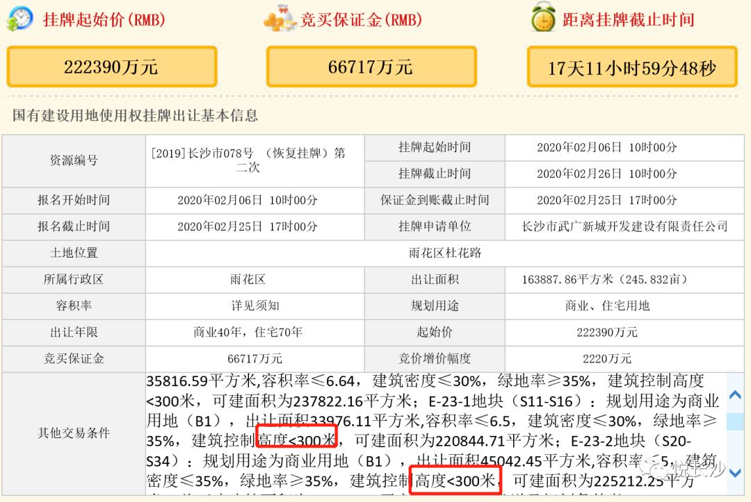 从竞拍条件来看,地位于雨花区杜花路[2019]长沙市078号地块,起始价222390万元,它的竞买人须具有城市综合体开发经验的同时,须在地块内建设两栋不低于249米的超高层地标性建筑,还要引进1家五星级品牌酒店,引进商务、金融、科技等高端产业资源。