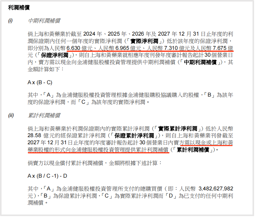 2024-2027年期间,上海和黄药业得保证净利润至少每年约5%的增长,不然就得给补偿,上限为9500万美元(约6.96亿元人民币)。
