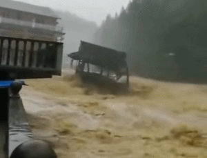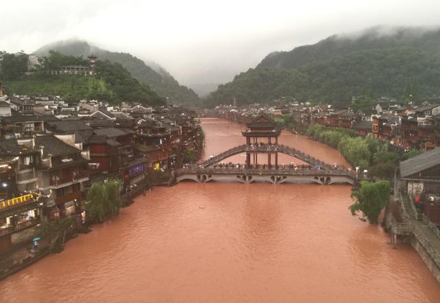 6月29日,湘西凤凰遭受大暴雨,沱江两岸昔日美丽的古城街道被汹涌的洪水淹没,难以行走