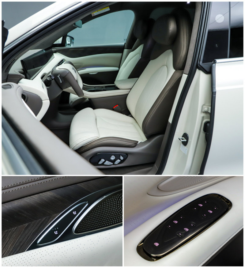 智己LS7的前排座椅采用了白棕双拼的设计,对于提升车辆内部的高级感与豪华感很有帮助。座椅全部由真皮材质包裹并且还在座椅上采用了打孔处理,甚至座椅上还搭载了扬声器能够让乘客体验更好的音响效果。另外车门上还配备了一键关闭车内声音的按键,类似于“一键闭麦”,或许是为了应付突如其来的重要电话。车窗控制依旧延续了L7上的设计,取消物理按键而全部采用触控式按键,虽然在一定程度上提升了车辆的科技感,不过却大大降低了驾驶者的盲操率,如今LS7依旧延续了这样的设计,那也只能让驾驶者自己去适应了。当然还有一点需要注意的是,LS7的主驾门为电动门,其余的则均为电吸门。