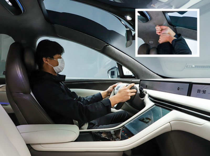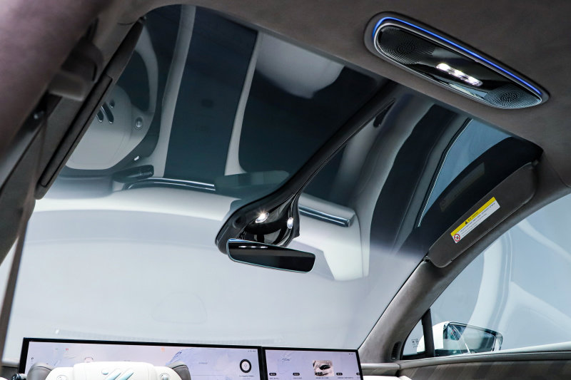 另外智己LS7的一大亮点就是拥有106度的开阔视野,通过加大前挡风玻璃的面积使得前排乘客的视野更加宽阔。用一个比较恰当的比喻来说就是看普通画幅电影和iMax电影的区别。另外对于这块前挡风玻璃,智己LS7还特地做了隔热处理,使用了三层镀银技术并且配备了渐变隔音隔热胶片,使得隔热性能大大提升,遮阳板也被配备到了A柱上,使用起来还是十分方便的。