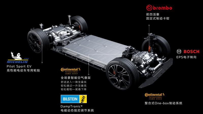 智己LS7的四驱版车型和L7保持了一样的动力水平,最大功率425kW,最大扭矩725N·m。而且智己LS7全系均配备了空气悬架,但是并没有配备L7上的四轮独立转向,这也是厂家在SUV车型上做的一个取舍,空气悬架能够带来更多的舒适性,或许更适合SUV车型。另外,LS7的空气悬架、减震器、电子转向等均来自知名供应商,从侧面反应LS7的确对于底盘的投入是不计成本的。