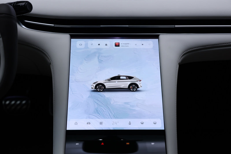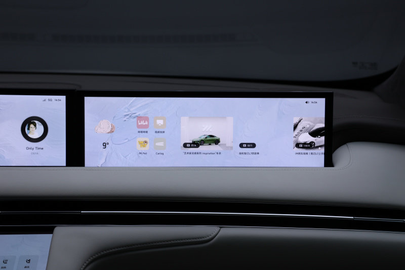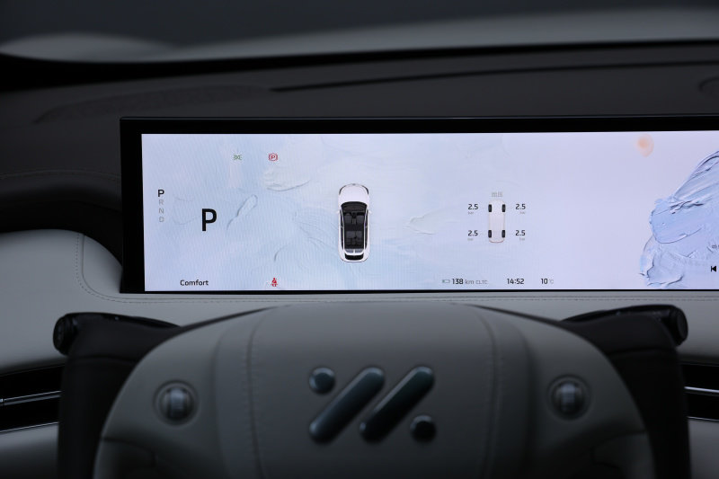 智己LS7的三块大屏分别是26.3英寸的主驾屏幕、12.3英寸的副驾屏幕和12.8英寸的中控屏幕。分工也有所不同,主驾屏幕负责显示车辆的挡位信息、车速、胎压数据、导航、360°全景影像等常规信息,副驾屏幕主要负责影音娱乐的功能。而中控区域屏幕包含车辆设置、座椅调节、空调温度等操作。另外在中控区域屏幕中还可以针对车辆的转向、悬架等做出调整,以此来获取更合适的驾驶模式。