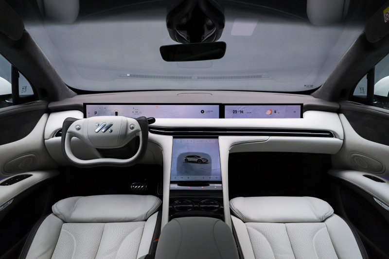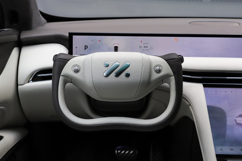 不过这其实也不是半辐式方向盘第一次装备在智己的车型上,之前智己L7 Snake Performance版本也同样采用了半辐式方向盘的设计,而智己LS7上的半辐式方向盘由于整个内饰搭配的关系,还采用白灰双拼的配色,看着更有高级感。而之所以采用半辐式方向盘的原因,我认为主要有两点,首先肯定是为了更出色的驾驶手感,不过在之前对于智己L7 Snake Performance版本的体验中,我认为驾驶者对于半辐式方向盘还存在一定的适应问题,如果不能熟练掌握,就会出现方向打不足的问题。另一点当然是因为这样能够拥有更好的视野,由于缺少了方向盘上半部的遮挡再加上可升降的屏幕能够让驾驶者获得更好的前方视野。
