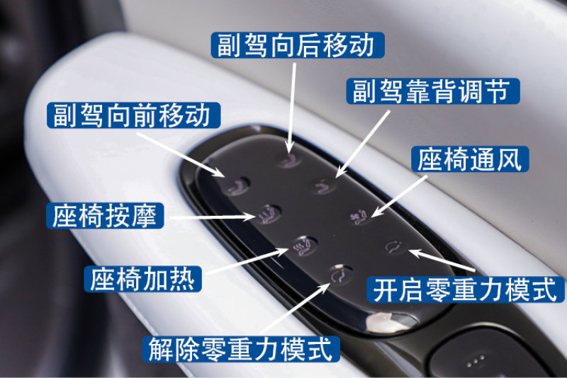 第二排座椅靠右的位置也是LS7车上的“老板位”,自然而言也配备了“老板键”,能够实现副驾的调节以及座椅加热/通风/按摩功能,并且还加入了零重力模式。