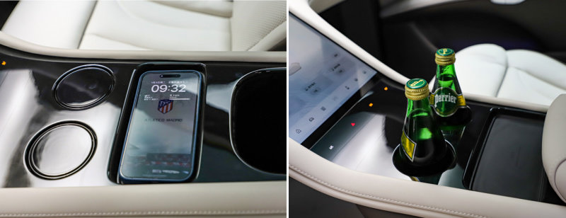 在中控屏幕之后则配备了两个杯架和手机无线充电的位置,这两个杯架并没有做掏空的处理,而是采用上下伸缩的设计,而且这个上下伸缩的阻尼感做的特别棒。