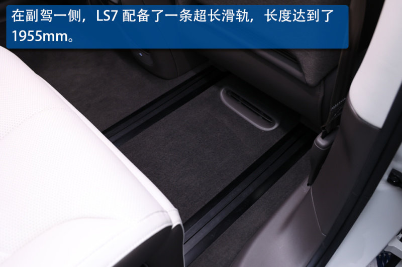 另外在副驾驶一侧,LS7还加入了一条超长滑轨,长度达到了1955mm。通过这条滑轨,可以实现“老板位”的模式调节以及副驾的位置调节。LS7的副驾座椅也可以实现100%电动全平折叠功能,并可滑动收折至仪表台下。也正是基于这些功能的配备,使得LS7具备了“零重力模式”以及“躺平模式”。