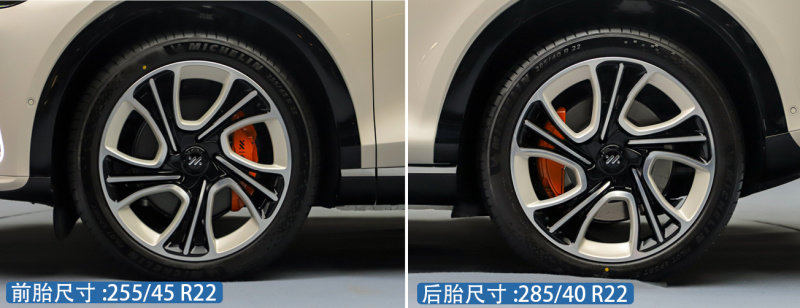 智己LS7采用了米其林Pilot Sport EV高性能专用轮胎,后胎尺寸为255/45 R22,后胎尺寸为285/40 R22。与智己L7一样,前后胎依旧采用了混合胎宽的设计,可见车辆在性能方面依旧有着一定的追求。另外LS7在前轮还标配Brembo四活塞卡钳,可以为车辆提供更强大的制动性能。
