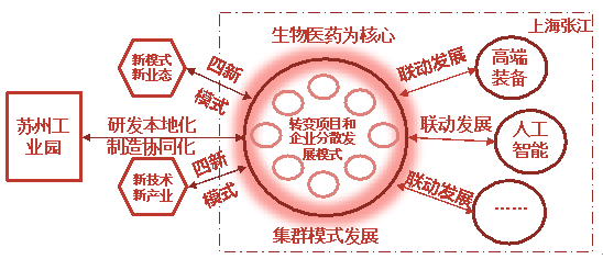 集群推动项目和企业的分散发展变为产业链的集群式发展,基本形成以生物医药为核心,联动周边高端装备和类脑科学、人工智能等产业的体系优势,不断推进新技术、新模式、新业态、新产业的“四新”发展模式。制造放在苏州工业园区,研发放在本地。