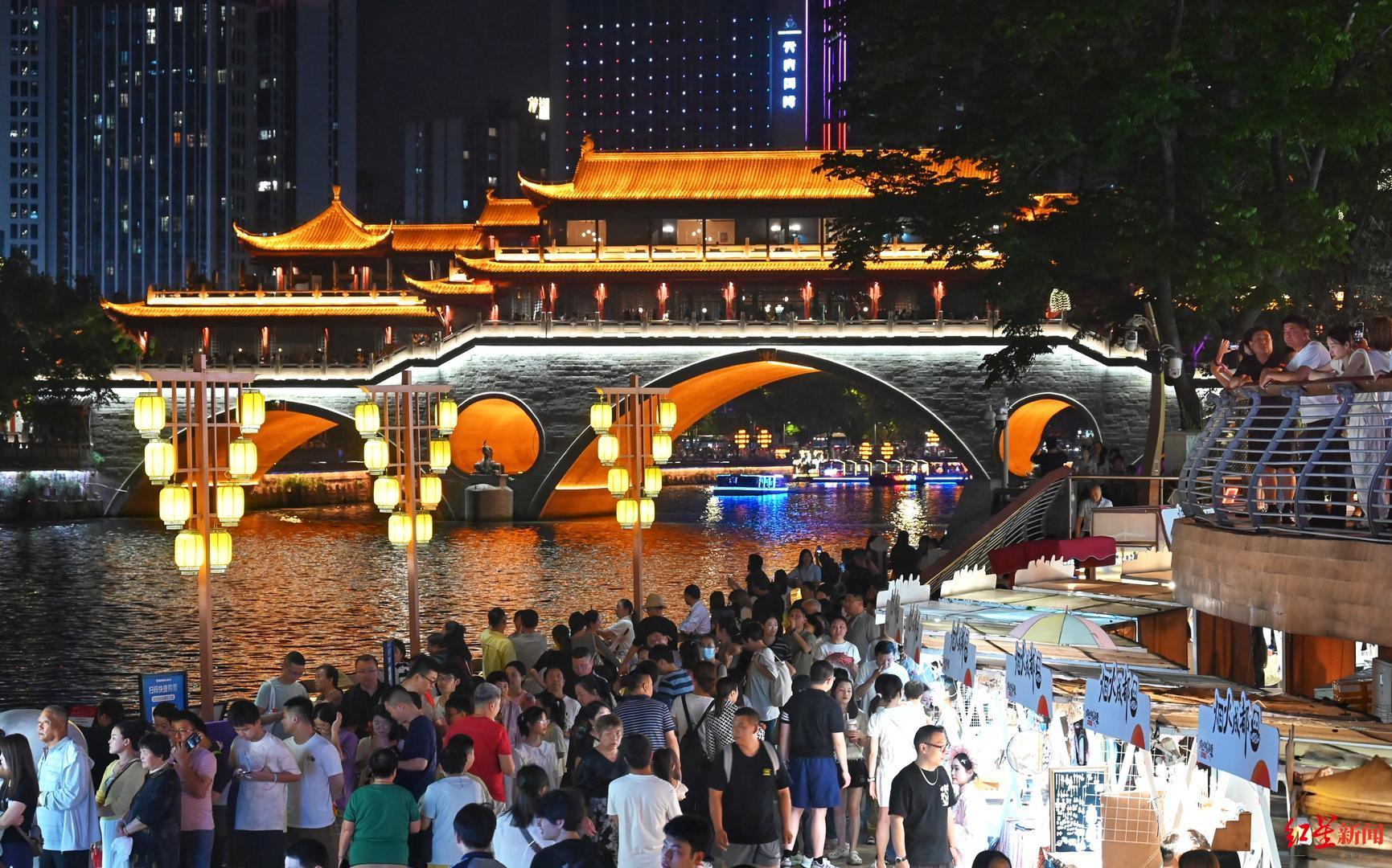 ▲“五一”假期,成都九眼桥酒吧一条街人头攒动,游船驶过锦江
