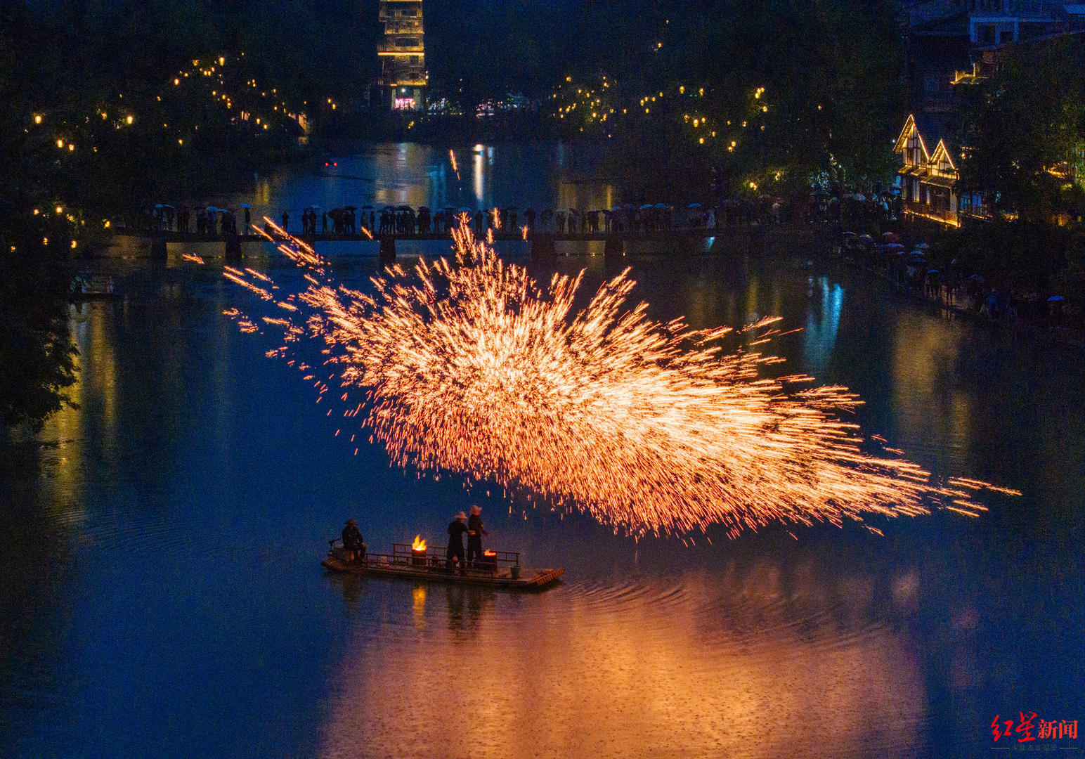 ▲邛崃夹关古镇的河面上,铁花飞舞,火树银花
