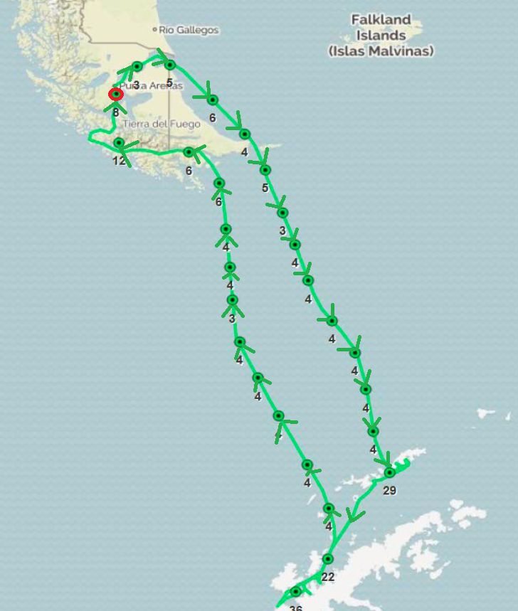 再往南就到达了南极洲真正的大陆:南极半岛。回程的时候,依然是穿过德雷克海峡,但路线稍微有一点儿不同:我们不再经过合恩角,而是路过阿根廷的乌斯怀亚,穿过智利和阿根廷之间的比格尔水道,最后回到蓬塔阿雷纳斯。
