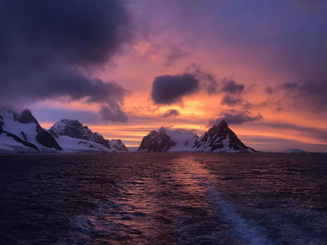 当我们刚刚一出利马水道,突然,天气一下子就变好了!我们在船尾看到了这个瑰丽的奇景!去南极十几次的探险队员都说,他们从来都没有看到过南极有这么漂亮的霞光。