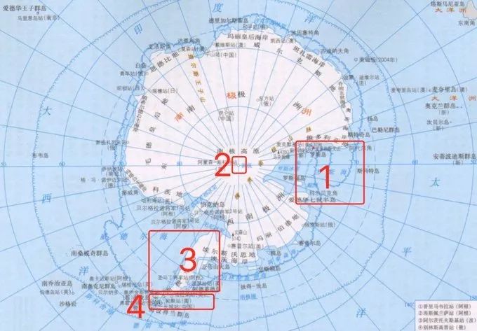 南极洲地图,如图标识是目前人类能在南极洲活动的区域