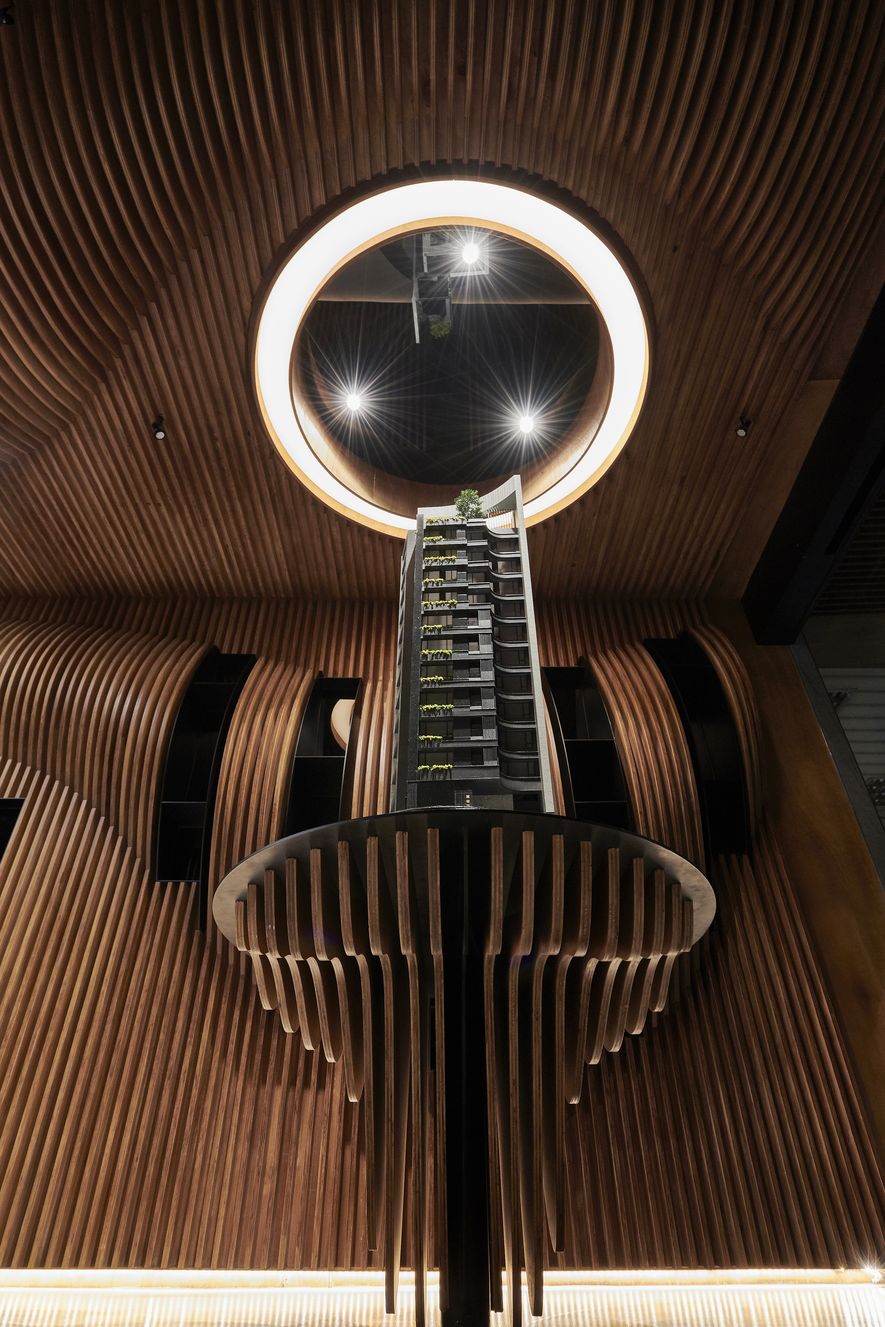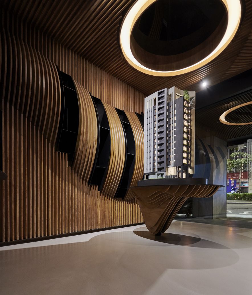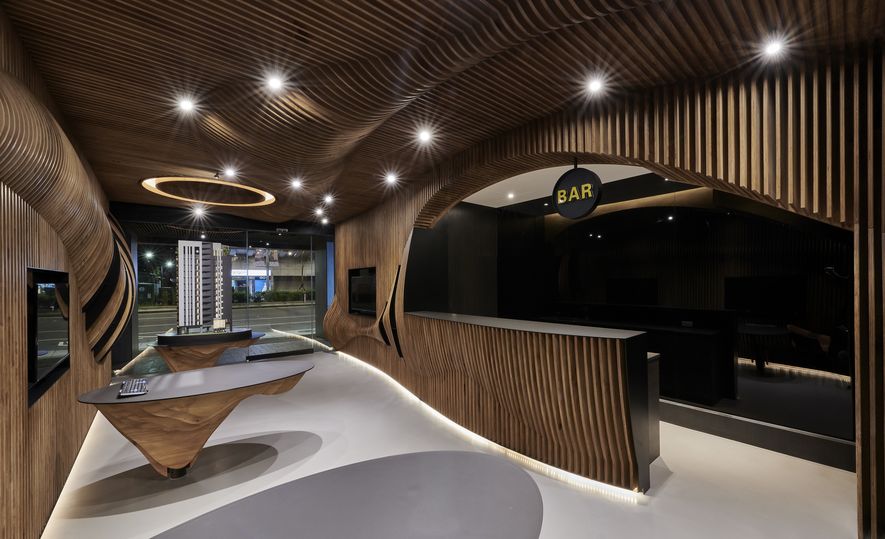 [b]居住的本质[/b] 我们想要把居住这件事回归到最原始的状态,想象远古人住在窑洞里,所有的空间,以及生活的道具都是同样的一种材料,空间中不会出现直线或是直角,视线里尽是历经时间的更迭所产生空间的绵延。 我们透过数字化的运算,将整个售楼处的空间以及销售用的道具,全部用木作夹板做成了一个整体式的设计,透过这样的设计让视觉经验产生一种主题性与特殊性,同一种材料以及工法,变成了墙壁,变成了桌子甚至是吧台,这也让路过的人产生了极大的视觉印象。