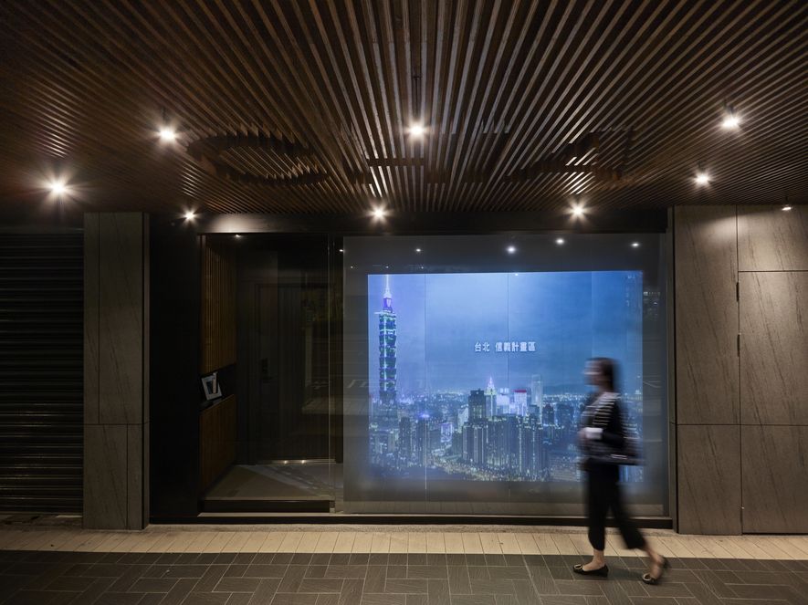 更特别的是我们在玻璃上贴了一种特别的智能膜,并架设了投影机,这智能膜白天是处于通透的状态,到了晚上,一切换成雾化模式,投影机打开,这橱窗就变成一台大型屏幕,不管是我们业主的历年实绩或是这建案的销售信息,甚至是NBA的季后赛,都可以直接在这屏幕上演,主要目的是要放大这橱窗的效应与趣味性…….. 一切的作为,都是要造成话题!