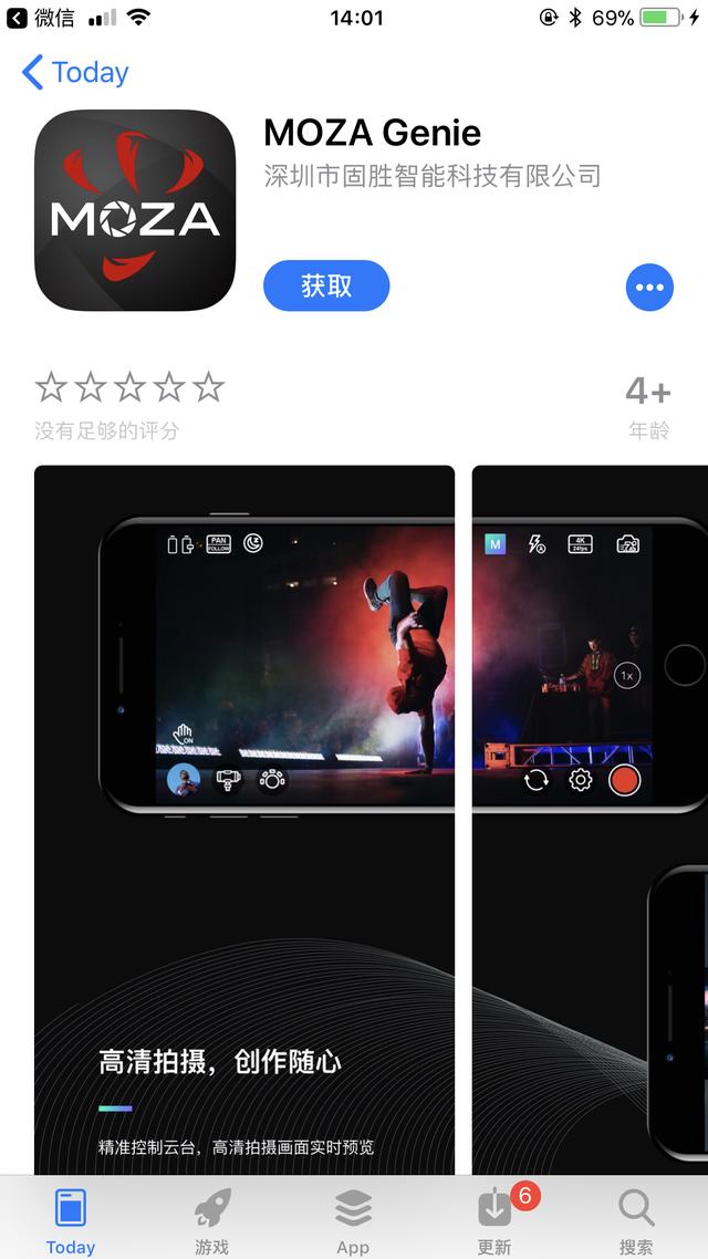 充好电之后,就可以下载手机APP了,兼容性能:苹果系统完美兼容,支持原生相机,创作更加自在,操作简单快捷灵敏,操作灵敏,打开软件,拍视频不卡顿