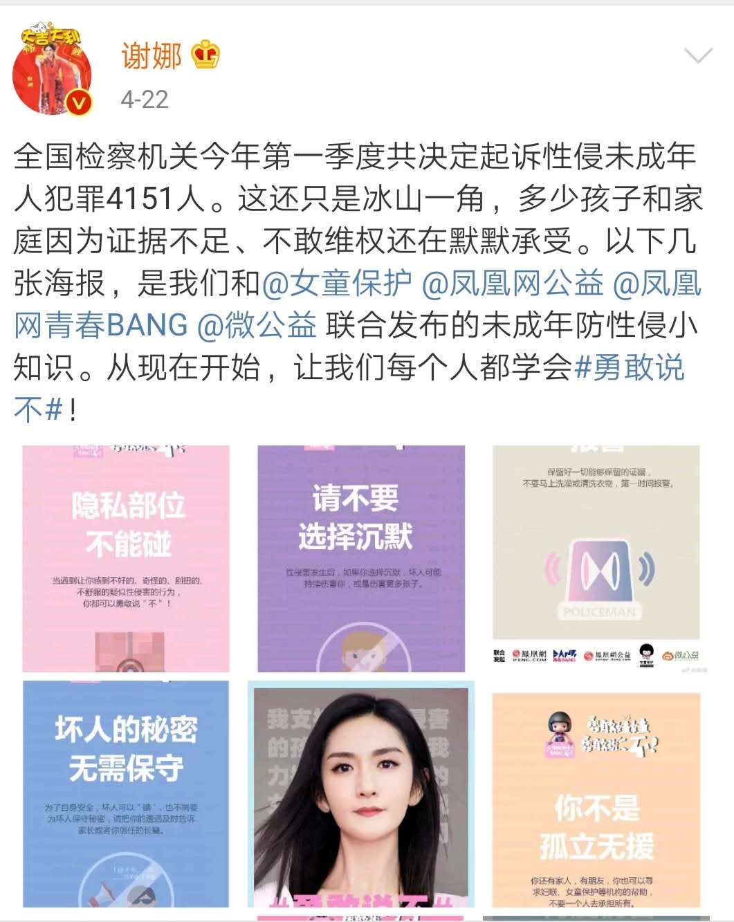 在4月14日,谢娜和女童保护基金联合发起话题#勇敢说不#后,4月22日,凤凰网公益、凤凰网青春BANG、女童保护基金和新浪微公益联合发起“勇敢娃娃,勇敢说不”公益倡导活动。谢娜参与此次活动,在其发起的同名话题下,传播儿童防性侵小知识,鼓励孩子们在遭遇性侵害的时候,勇敢拒绝,勇敢说“不”,倡导社会大众对受害者更包容,营造平等环境。