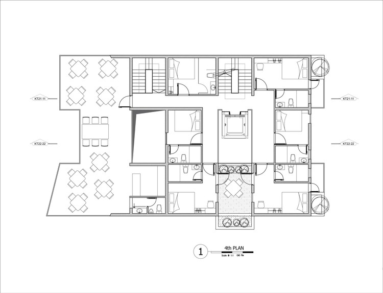 在五层:我们设计了两套公寓。为什么要这么做呢?有两个原因:首先,这块用于建设的土地是租来的,所以房主需要一个能够保证收入的方案;在上面建公寓的话,可以轻松地收到比旅舍更高的租金。第二,由于这一地区对度假公寓的需求巨大,但周边地区并不能满足这一需求,因此公寓的出租率能得到保证。