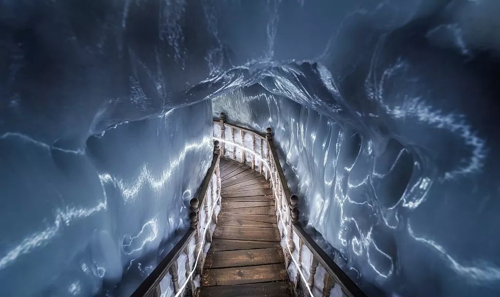 顺着扶梯走进冰洞,只见洞顶顺流而下的巨型冰锥,像瞬间定格的流星火,在眼前热烈绽放,美不胜收。附在石灰岩上的冰层厚度不一,在洞里演绎着精彩纷呈的艺术冰展,冰柱、冰石笋、冰葡萄、冰涡管……配上五颜六色的灯光,乐享一场视觉盛宴。