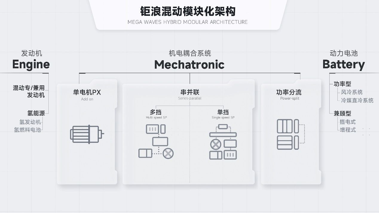 在减碳方面,混合动力科技是不可忽视的力量。广汽集团以打造中国最强混动系统为目标,于2022年4月发布了全新的混动技术品牌——钜浪混动,并在本次广汽科技日正式发布了钜浪混动的技术支撑——钜浪混动模块化架构,以体系化的技术革新,带来智能化和电气化的历史性跨越。该架构由混动发动机(E)、机电耦合系统(M)和动力电池(B)三大部分构成,采用平台化、模块化设计,兼容性强、通用性高,可衍生出4大类别和N个动总组合,完美适配所有HEV、PHEV和REEV等XEV车型。