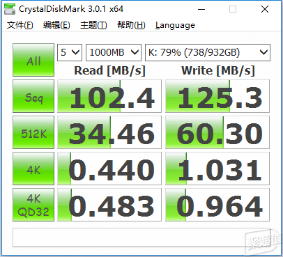读102.4MB/s,写125.3MB/s,正常速度了。