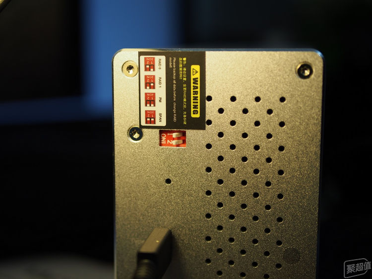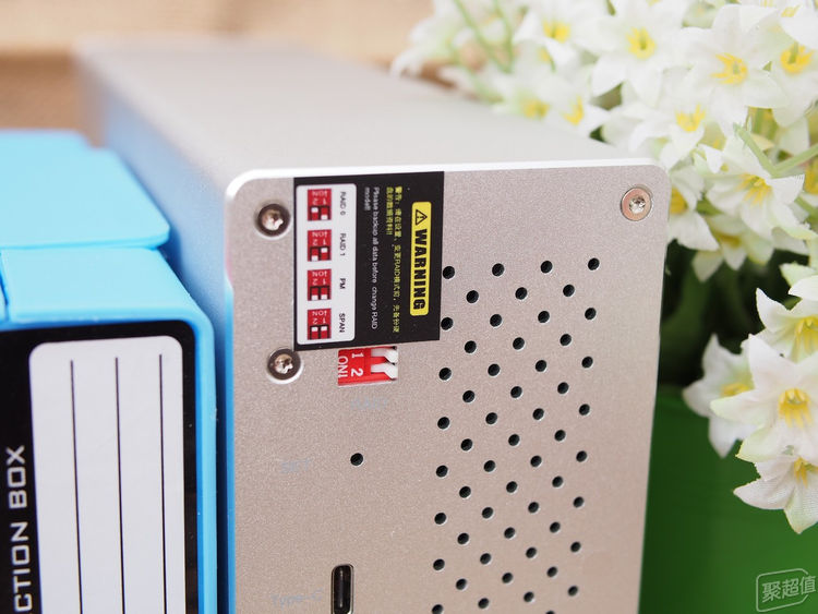 背部同样简洁,可以看到的接口有Raid控制开关,Type-C的数据传输接口,电源开关和电源接口。