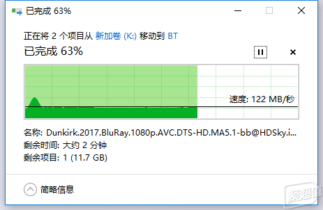 实际文件拷贝速度也能达到120MB/s,速度让人满意了。