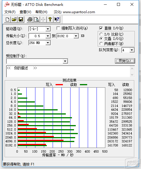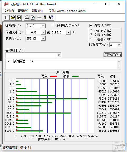 ATTO的测速则有点看不懂了,读取速度有点变态了,写入则比较正常。