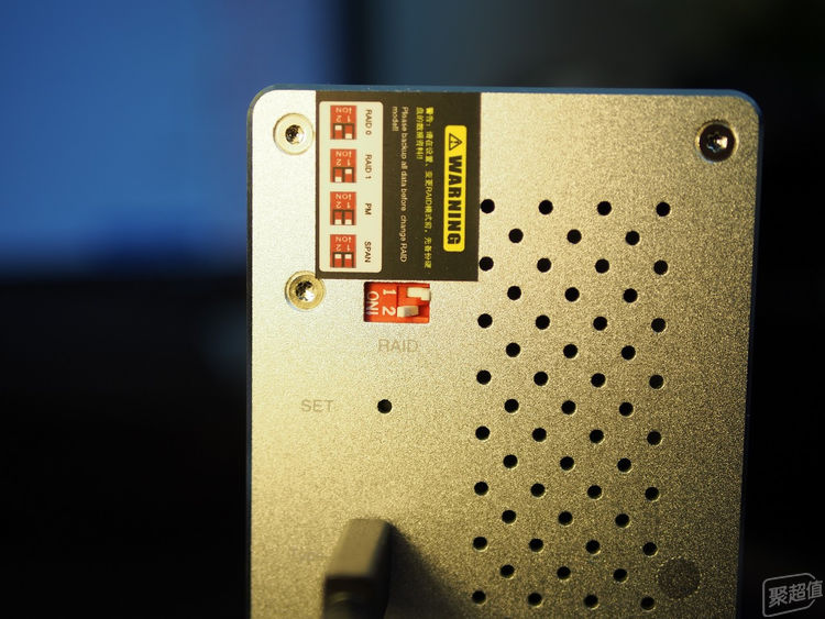下面再来试试RAID0模式,RAID0是将硬盘柜中的所有硬盘容量合并,并提升性能。这时需要将开关按图上排列,同时按住SET键不放,开启硬盘盒,大约6秒后松开,组建RAID模式成功。