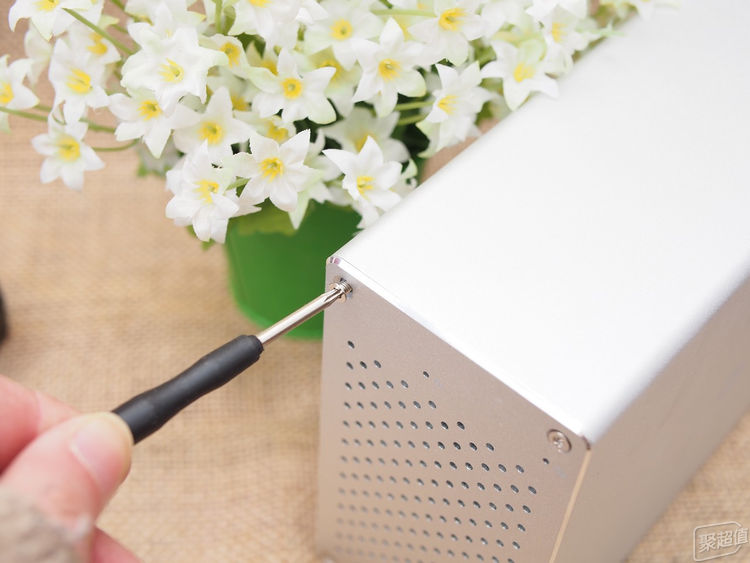 由于硬盘柜采用了全封闭的架构,所以安装硬盘的时候必须拧开面板上的固定螺丝。