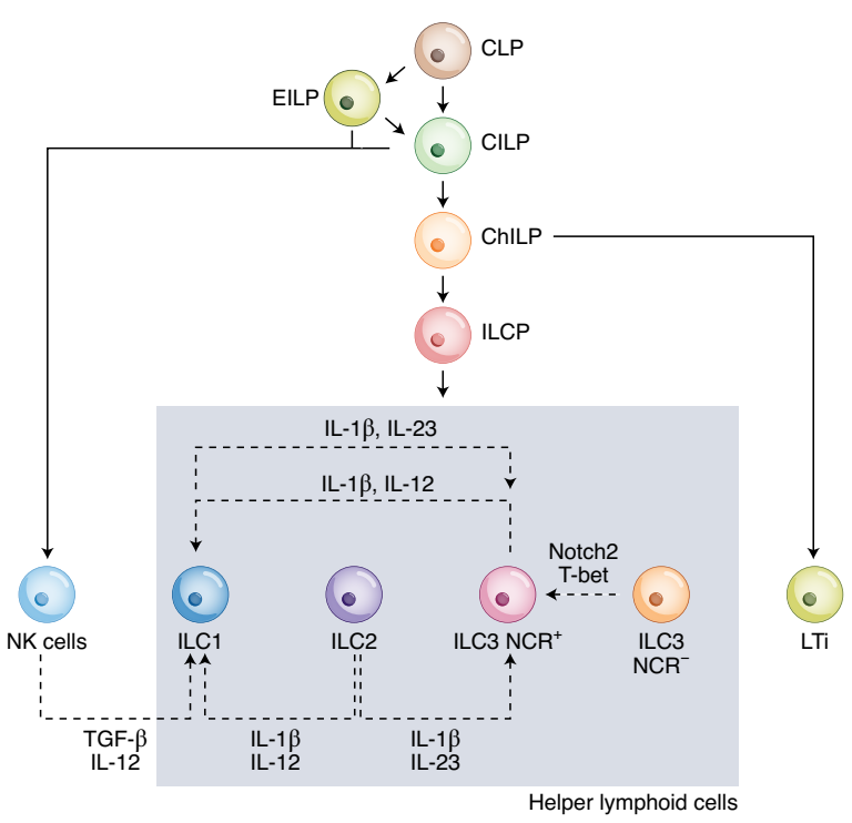 TGF-β还能够促进NCR-ILC3向NCR+ILC3分化,NCR+ILC3能够在IL-1β、IL-12诱导下基序分化为ILC-1,并能够分泌IFN-γ。