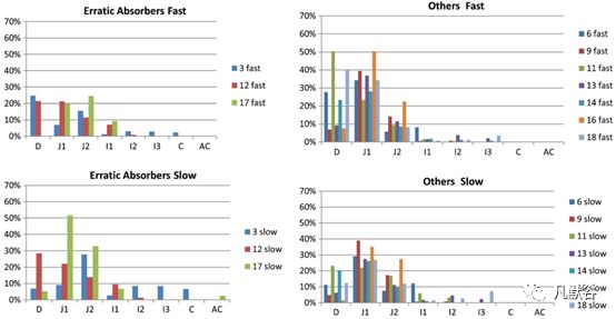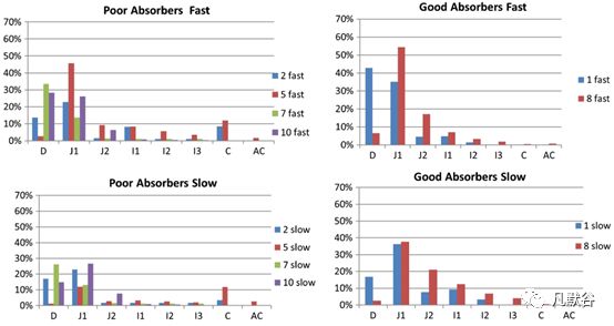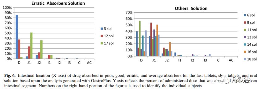 为了更加清晰地理解内在的原因,又考察了每种类型受试者在各个肠段的药物吸收情况,如下图。对于吸收较好的受试者相对吸收较差的受试者在小肠上端有更好的溶出与吸收,吸收较差的受试者主要表现出在小肠上端吸收较差,未吸收的药物转运至回肠和大肠,而在这些肠段环丙沙星的吸收也很差。与吸收较差受试者相比,吸收均等的受试者似乎在空肠肠段2(J2)吸收更多药物,并且在十二指肠(D)和空肠1肠段(J1)中具有相似但略低的吸收,如下图。