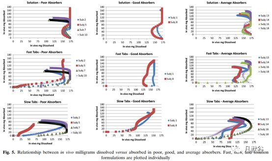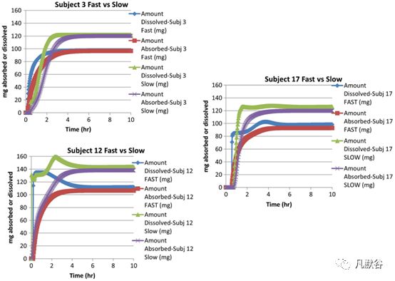 受试者5的情况比较特殊,由于慢速释放制剂的生物利用度较差,将其归到吸收较差的一类,但是该受试者对口服溶液剂几乎达到完全吸收。对于吸收不稳定类(受试者3、12、17),慢速释放制剂的体内溶出超出了快速释放制剂,从而导致更高的药物吸收,慢速和快速释放制剂的体内差异主要出现在前两小时,如下图。因此尽管在很多受试者体内,快速释放制剂溶出的量超过了慢速释放制剂,但是和体内暴露最相关的是前2小时体内药物溶出的总量。