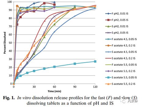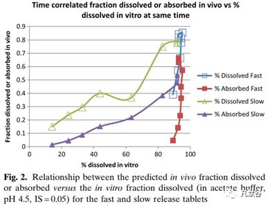 只有慢速释放制剂的pH 4.5醋酸盐缓冲液最能够反映体内PK;而快速释放制剂不具有相关性(体内释放之前体外已经几乎完全释放),如下图,该图反映了制剂的体内溶出和体内吸收的相关性。