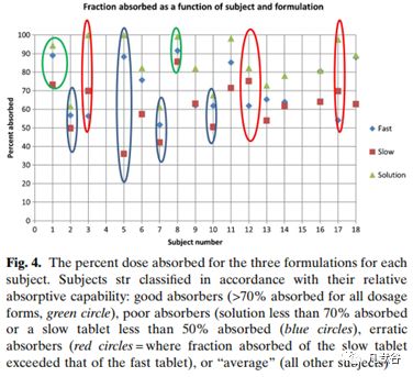 吸收不稳定(慢速制剂的吸收大于快速释放制剂的吸收):受试者3、12、17;