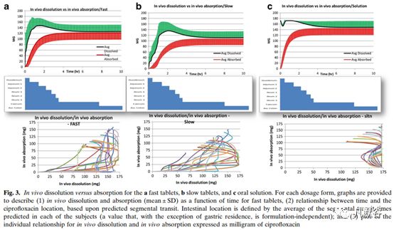 本研究使用高级胃肠道吸收与转运ACAT模型研究药物制剂的体内行为,得到药物在不同肠段的吸收和溶出的可视化特征,从而可确定影响环丙沙星口服生物利用度的关键制剂变量。此外,使用建模和模拟能够考察不同受试者及人群中体内剂型行为的潜在差异。通过分析每个受试者的体内数据,分析不同受试者吸收的差异,可更好地理解药物制剂在各种可能遇到的生理条件的行为,从而指导临床实践。