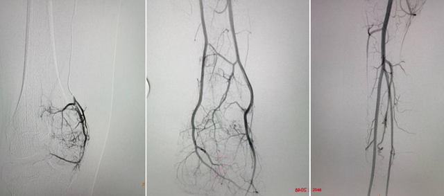 (3)动脉分支的末梢可见毛细血管过早显影染色较深,并可见静脉早期显影现象,但未见直接瘘道。