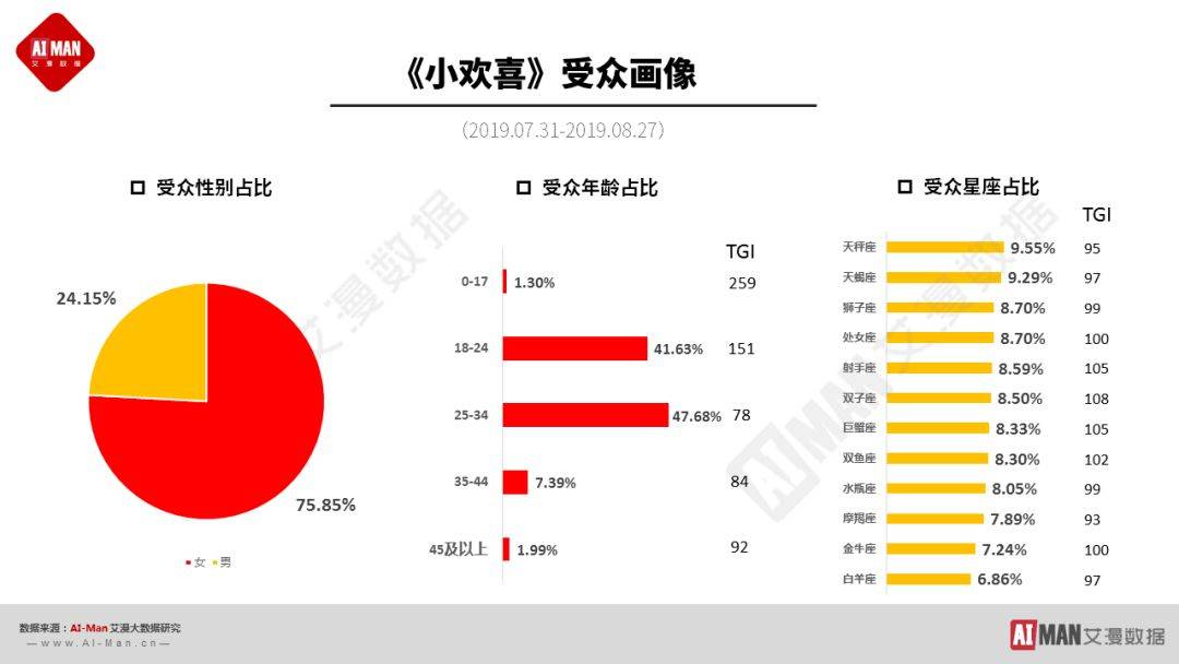 《小欢喜》受众画像显示,女性受众占比达75.85%,超88%受众年龄处于18-34岁之间,其中18-24岁TGI较高。在星座排行中,天秤座人群占比达9.55%,位列第一。但双子座成为TGI最高的星座。