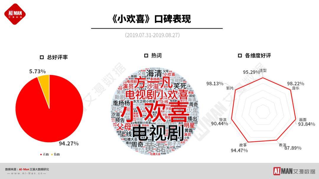 艾漫数据结果显示,《小欢喜》整体好评率达94.27%,超越近期热播电视剧。接地气的台词和表演,收获网友高度肯定,除表演维度外,各维度好评率皆破九,其中影片和音乐两个维度的好评率更是超过98%。而“方一凡”、“海清”、“黄磊”也成为该剧热度较高词汇。