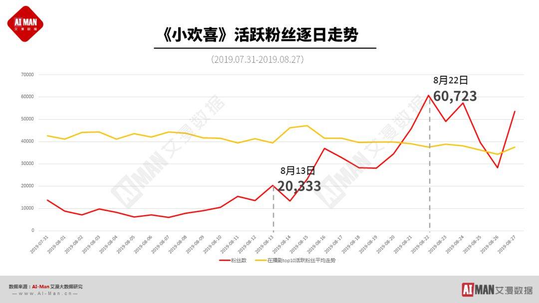 在近一个月的播放周期内,该剧活跃粉丝呈现缓冲式上涨。8月13日话题#童文洁方一凡吵架#登上微博热搜榜,使得活跃粉丝数迎来首个小高峰。随着剧情的推进,刘静得癌症、英子要跳河、磊儿错过清华,让网友大呼疑惑“小欢喜哪里欢喜了”?8月22日活跃粉丝数达到最高值60,723。