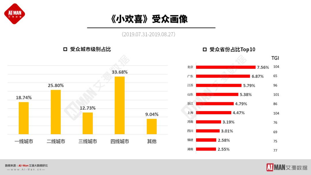 此外,在受众城市级别占比中,四线城市占比高达33.68%。城市本身对高考的高度关注,促发受众的大批量沉淀。因该剧发生背景在北京,在受众省份排行中,北京占比达7.56%位列第一,广东位列第2,而江苏和山东两个“高考大省”,也紧随其后。