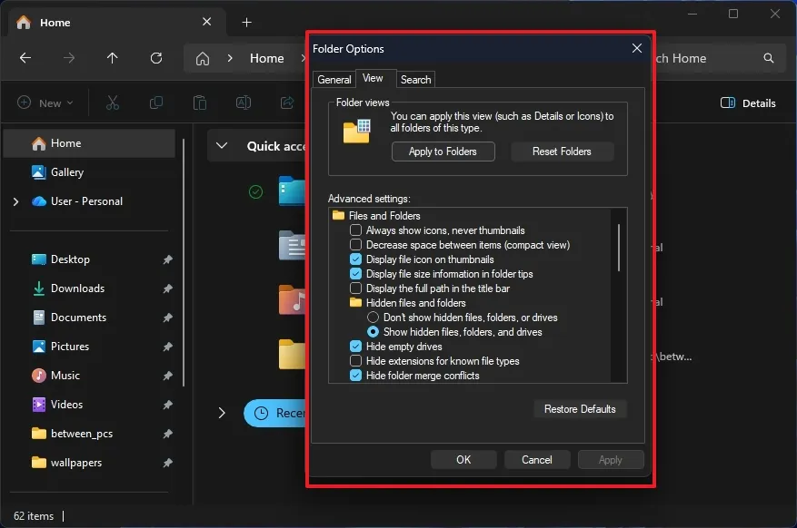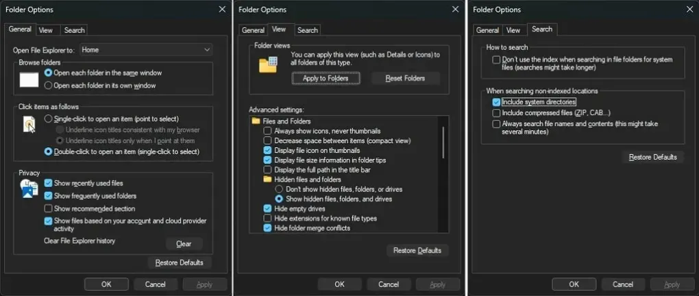 本次更新最受关注的改进,是微软进一步扩大文件资源管理器(File Explorer)的深色模式覆盖范围。“文件夹选项”对话框及其所有子标签页此前在深色模式下仍显示为白色,破坏了视觉统一性。