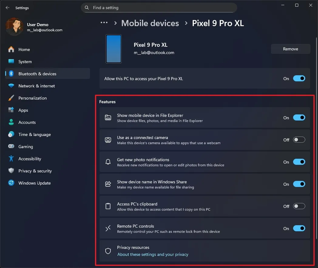以往连接和管理手机需要跳转到一个独立的页面,而现在所有相关选项都被整合进了“设置 > 蓝牙和设备 > 移动设备”页面内,操作路径更短。