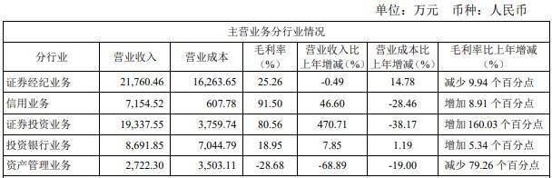 主营业务具体来看,公司证券经纪业务、资产管理业务收入、毛利率均下滑;信用业务、证券投资业务、投资银行业务收入、毛利率均增长。