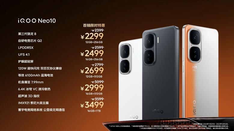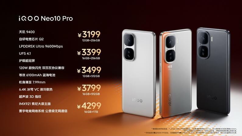 iQOO Neo10系列共有“拉力橙”、“驰光白”和“疾影黑”三种配色可选,全系列发布即开售,Neo10 Pro提供12GB+256GB、12GB+512GB、16GB+256GB、16GB+512GB和16GB+1TB五种存储组合可选,到手价3199元起;Neo10提供12GB+256GB、12GB+512GB、16GB+256GB、16GB+512GB和16GB+1TB五种存储组合可选,到手价2299元起。