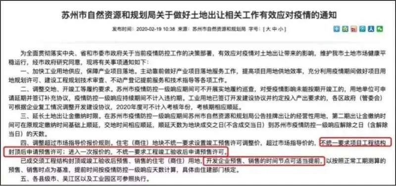 而在2020年2月19日的新政策中,苏州对土地出让规则作出调整,提出住宅(商住)地块不统一要求设置竣工预售许可调整价,超过市场指导价的,不统一要求项目工程结构封顶后申请预售许可;进入一次报价的,不统一要求工程竣工验收后申请预售许可。